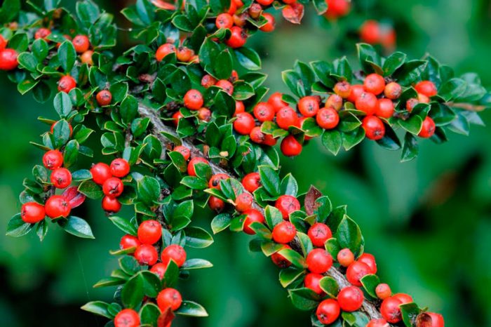 Popular red-fruited species and varieties of cotoneaster in gardening include Dammer, Alaunsky, common and multi-flowered.