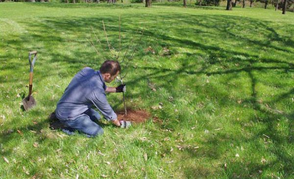 Pour 10 liters of water into the hole and add a layer of sand and compost. The soil removed from the hole is mixed with a small amount of compost, superphosphate, and potassium fertilizer. The seedling is then placed in the hole, the roots are carefully spread out, and a layer of prepared soil is added, leaving 5 cm of the root collar exposed. After this, the planted tree is watered with 15 liters of water, and the soil around it is firmly tamped down.