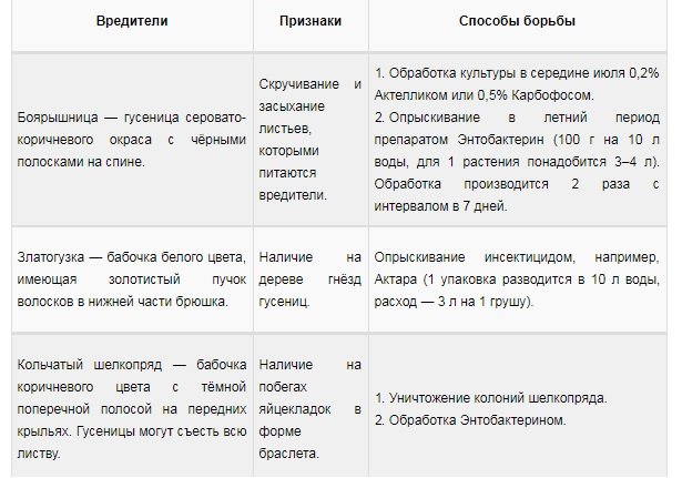 The main pests of this variety are the hawthorn moth, the goldentail moth, and the ringed silkworm. Signs of insect presence and effective control methods are presented in the table below:
