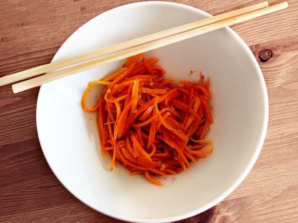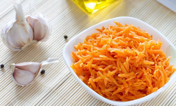 Grate the carrots and toss them in a dressing made from garlic, sugar, salt, vinegar, coriander, and spices. Those who prefer a more spicy dish can add more garlic, vinegar, and red pepper flakes.