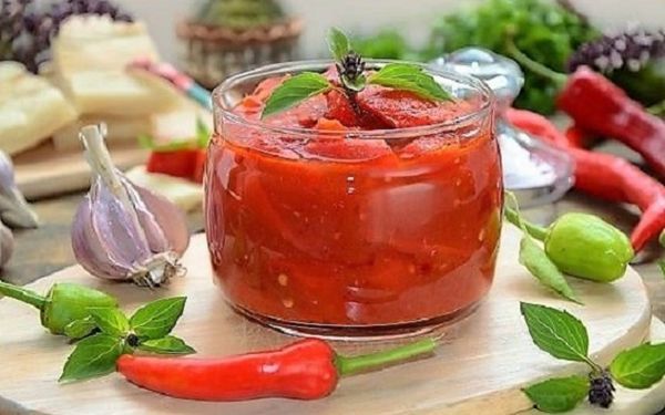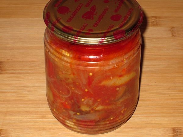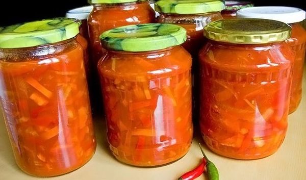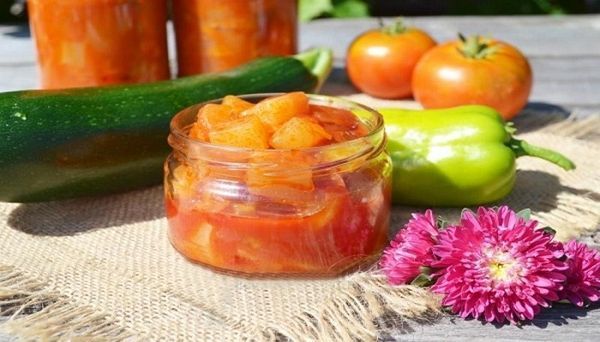 The bell peppers are roasted, then peeled and chopped. The tomatoes are blanched, peeled, chopped, pureed, and added to a saucepan. Add the garlic and tomato paste, fried in butter, and bring to a boil. Then add zucchini strips up to 3 cm long and finely chopped hot peppers, and cook for 10 minutes.