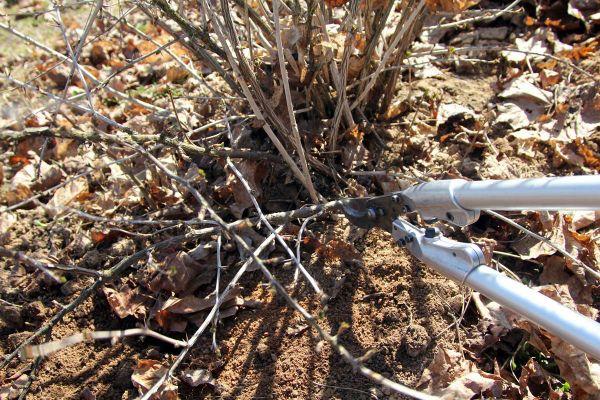 - We begin working from the base of the bush (from the growing point). First, prune all branches lying on the ground—they are more susceptible to disease and shade, so they rarely bear fruit.