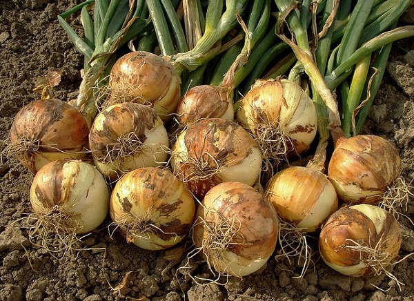 Onions should be harvested when new green shoots have stopped forming and the old leaves have dried out and are spreading along the ground. This should be done in dry weather. After this, the harvest is dried in the sun and then left to dry in the attic for another two weeks. The onion can be stored with the thin, dried neck.