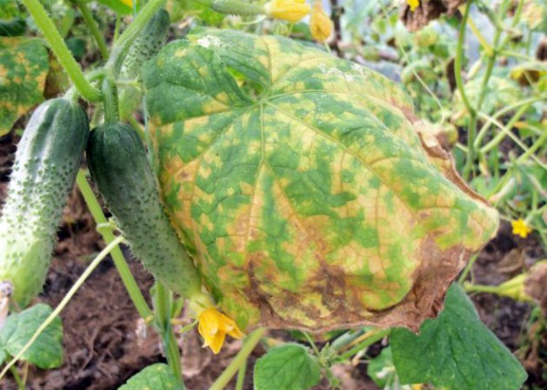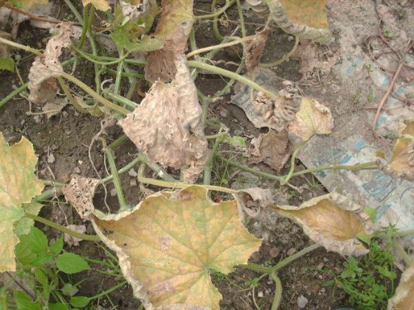 Cucumbers, like all cucurbits, are susceptible to rot diseases that appear during the fruiting period. White rot often attacks shoots at the roots, as well as unripe fruits, forming a white coating on the cucumber bud. Damage to the stems at the base cuts off the supply of nutrients from the soil, causing the leaves to turn yellow and dry out. Brown spots and yellowed edges on the leaves also indicate rot. Cucumbers can be treated for this affliction with specialized products, such as Trichodermin and its analogues. These are typically powders that are diluted in water and applied as a spray or watering agent.