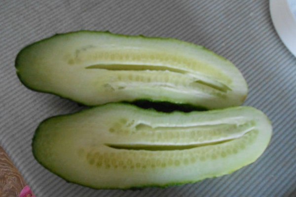 Cucumbers can appear hollow inside due to abnormal growth of the placenta, where the seed rudiments are located. Since the placenta supplies the seeds with nutrients and continues to develop, disrupted growth can cause abnormalities within the entire fetus.