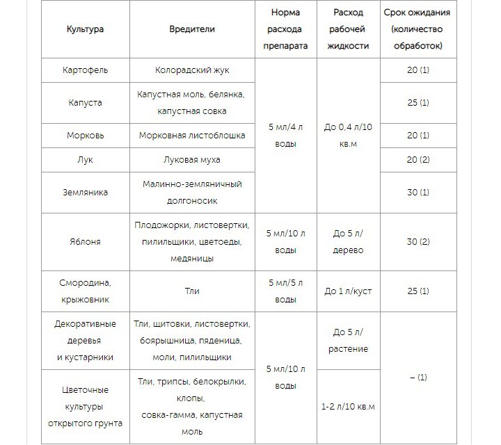 - Vegetable crops are treated with a solution in which 5 ml of the substance is diluted in 4 liters of water.