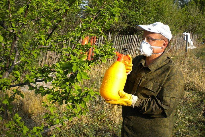 - Apple trees are sprayed with a solution of 5 ml of the substance per 10 liters of water.