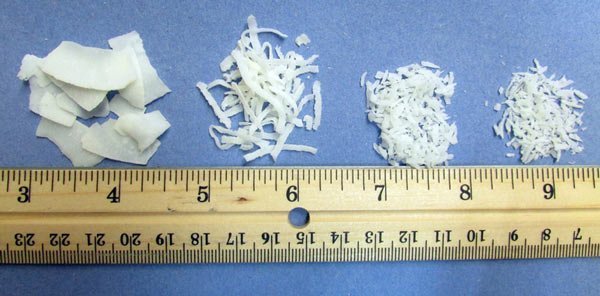 Coconut pulp is processed into shreds using industrial equipment. This process varies from factory to factory. Depending on how it's crushed, sifted, and what's left, the final product is divided into grades: