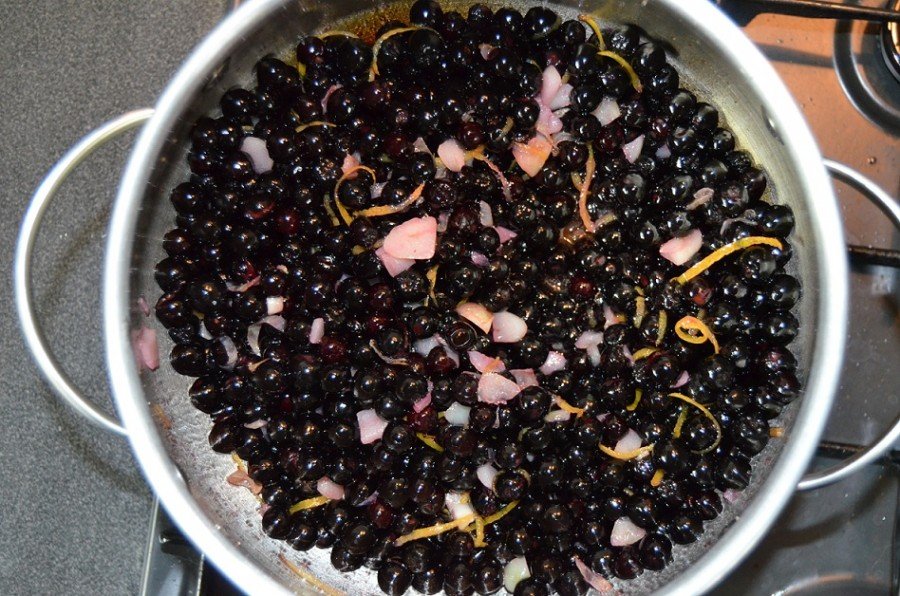 The berries are covered with water, boiled for 30 minutes, and left to cool for 12 hours. Then, they are filtered through cheesecloth. Sugar is added to the container with the must, and the mixture is brought to a boil again. The remaining ingredients are added, stirred, and the heat is turned off. Cool, strain, and bottle the mixture. It can be served without aging.