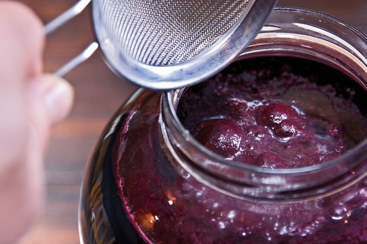 You'll need a lid with holes to allow gases to escape. Stir or shake the mixture daily. After a week, add more sugar, stir, and let it sit. Repeat the same procedure a week later. After another two weeks, add the remaining sugar and wait until the berries sink to the bottom. The liquid should clear. Strain and pour into bottles or other jars with tight lids.
