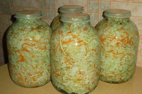 The finished product, sealed for the winter, should be stored only in glass jars. The storage temperature should not fall below -2°C or rise above freezing. The best place to store it is a balcony, loggia, refrigerator, or cellar. Depending on the recipe you use to pickle the cabbage, its shelf life can range from several weeks to a year.