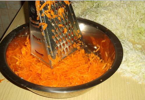 - Finely chop 3 kg of the main ingredient. Shred 500 g of carrots.