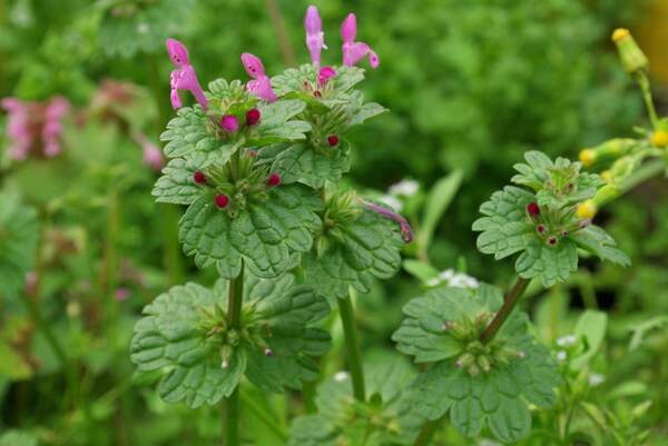 An annual herbaceous plant growing approximately 40 cm tall, it thrives in shaded areas, actively filling any available space and suffocating neighboring plantings. Deadnettle is known for its medicinal properties for liver, kidney, and respiratory ailments.