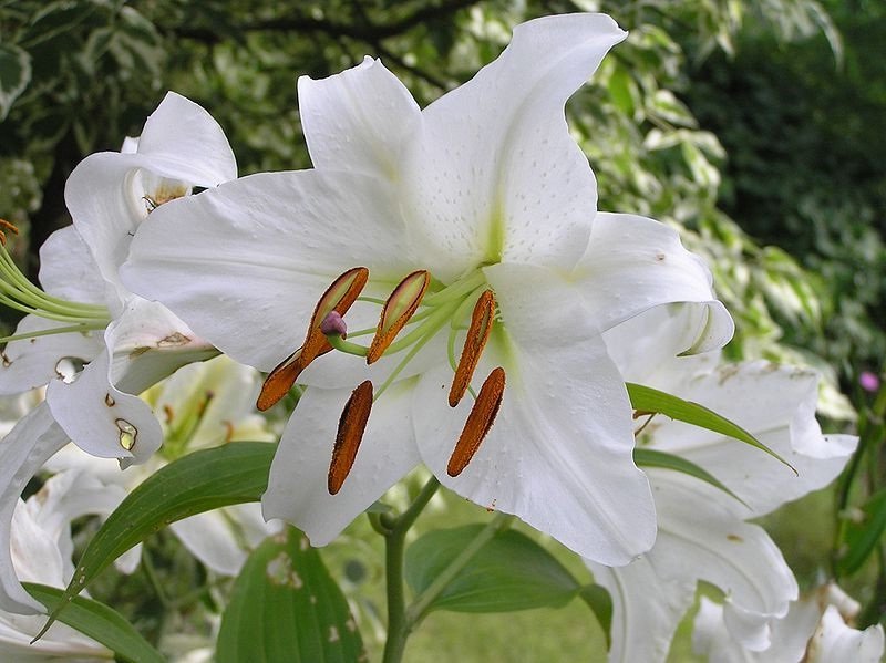 - Apollo. Grows up to 1.2 m. Flowering lasts only two months (June-July). The 10-12 cm corollas are snow-white with fine dark speckles around the center.