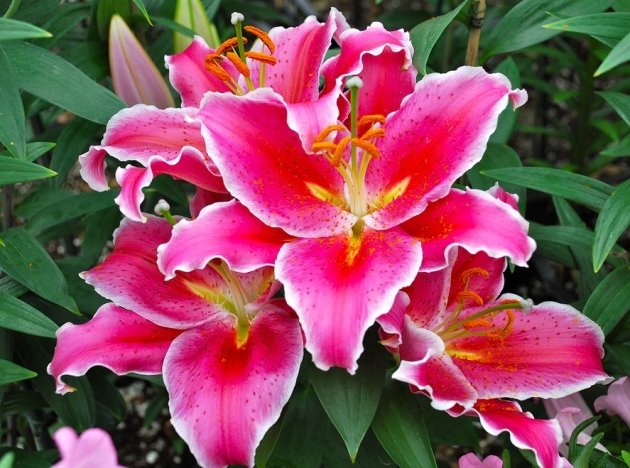 One of the most beautiful representatives of the genus Lily. The group is represented by a wide variety of shapes and colors. The stems vary in length, but the corollas are truly gigantic – 30-35 cm. Oriental hybrids are characterized by late flowering, beginning in August-September. The most common varieties are: