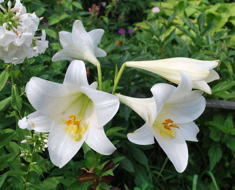 - White Heaven. A medium-sized hybrid growing up to 1 m tall. The corollas are snow-white, turning pale green toward the center. This lily blooms in the second half of summer.