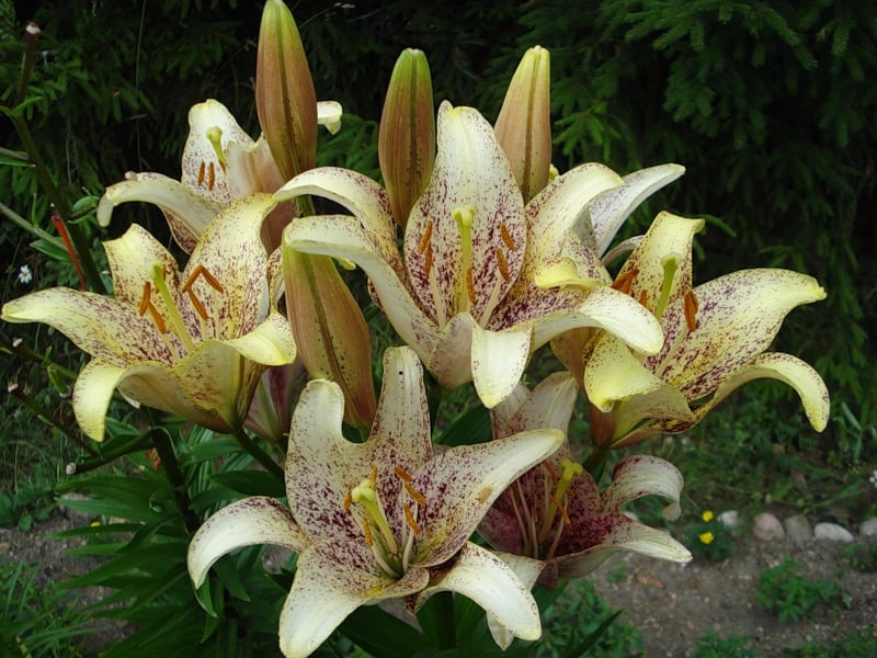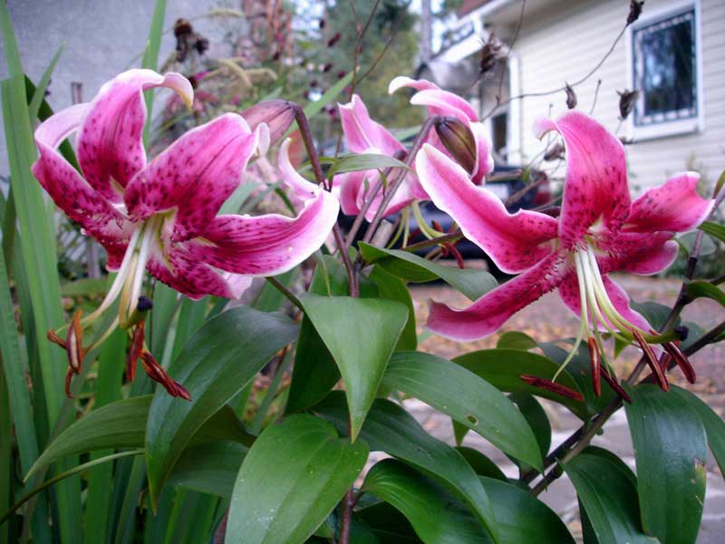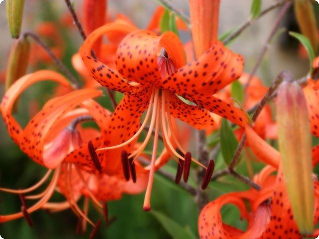 Lilies in this section are also called lanceolate lilies by some gardeners. Traditional tiger lilies have given rise to a whole line of hybrids in a variety of colors. The corolla is turban-shaped, and the petals are dotted with dark spots along their entire length. Here are just a few of the varieties: