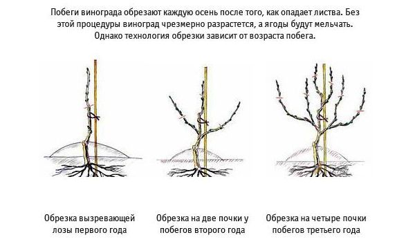 In the first year, the mature vine is pruned to 2-3 buds. In subsequent years, 2-3 large shoots with 4-5 offshoots are left on the bush, which are also pruned to 2-3 buds. This results in a bush with 13-15 fruiting shoots, which is considered optimal for this hybrid.