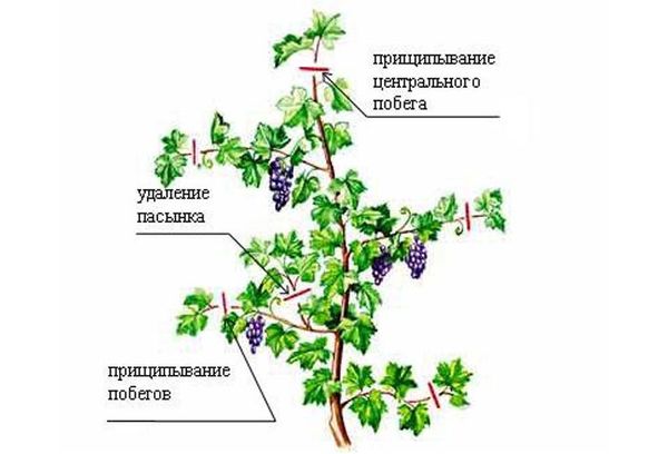 Grape pruning is a process that involves removing the unripened upper parts of the shoots. The cutting is done down to the point where the first leaf grows. Unlike pinching, the apical shoot is trimmed back to a length of up to 40 cm. Pruning promotes faster ripening of the berries by stimulating proper nutrition in the bunches.