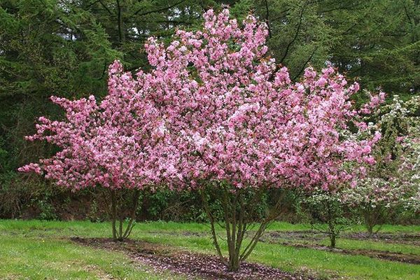 These low-growing varieties are easy to shape into hedges. Just prune the young shoots carefully, and you'll have the hedge of your dreams. This ornamental apple tree boasts vibrant blooms, making it completely red during this period.
