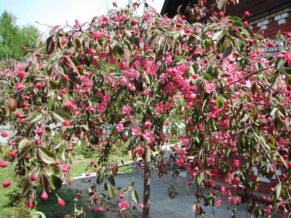 It looks like a low, oval-shaped bush with a wide, dense crown. It's distinguished by its deep red buds, which attract attention even before they open. Eventually, the apple tree becomes covered in red flowers that begin to emit a pleasant raspberry aroma.