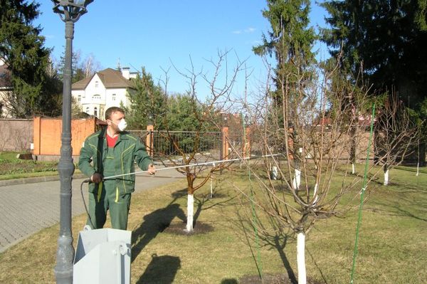 Trees can be treated with chemicals such as Kinmix before bud break. Otherwise, the products will burn young and tender parts. Before treating apple trees with chemicals in the spring for pests, the tree's crown should be pruned, the trunk should be cleared of old bark and lichen, and any damaged parts should be removed.